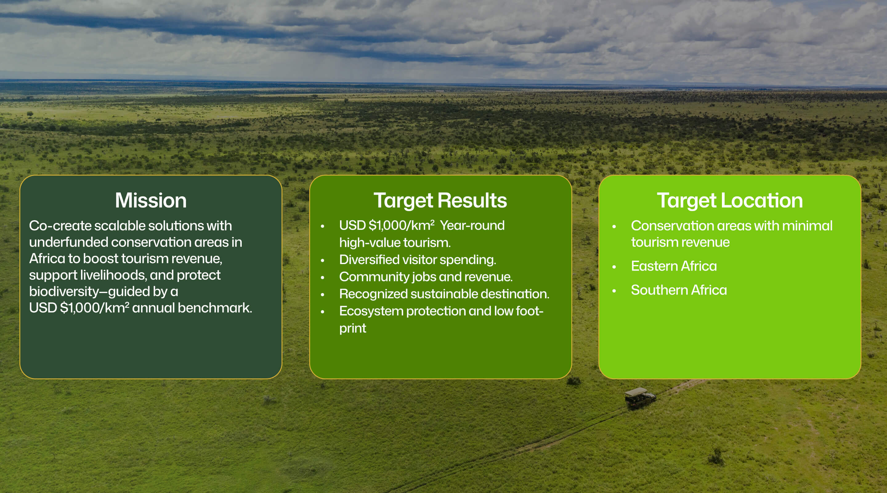 We partner with conservation areas, co-creating regenerative tourism solutions that deliver $1,000/km²/year and greater impact to people and nature.